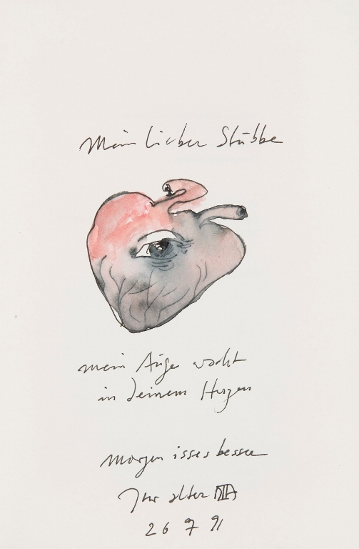 Der feine, mit Lesebändchen ausgestattete New Yorker Ausstellungskatalog, hier mit Unikatcharakter: Mit kleiner aquarellierter Tuschzeichnung Herzauge im Format 16,0 x 10,0 cm dem Hamburger Kunsthistoriker Wolf Stubbe gewidmet: Mein lieber Stubbe mein Auge wacht in deinem Herzen morgen isses besser Ihr alter Janssen 26 7 91